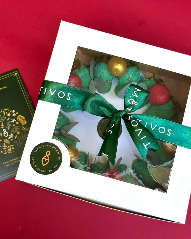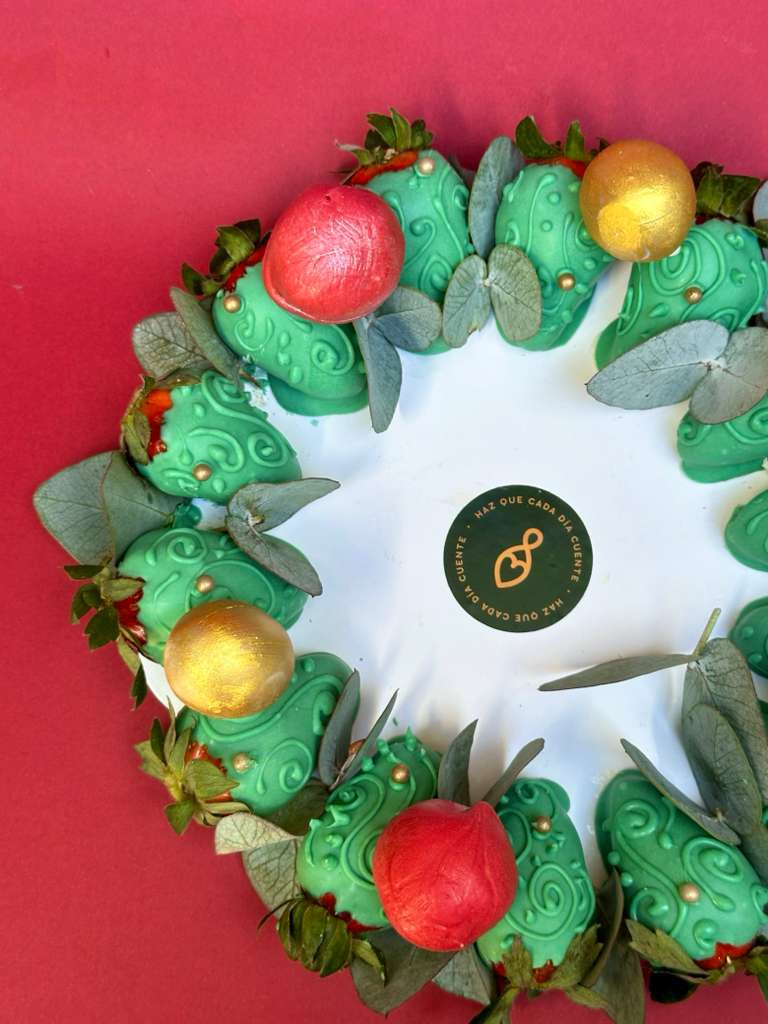 Sorprende a tus seres queridos con esta exquisita corona navideña de fresas con chocolate y mini brownie balls irresistibles.
